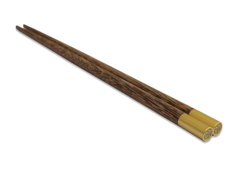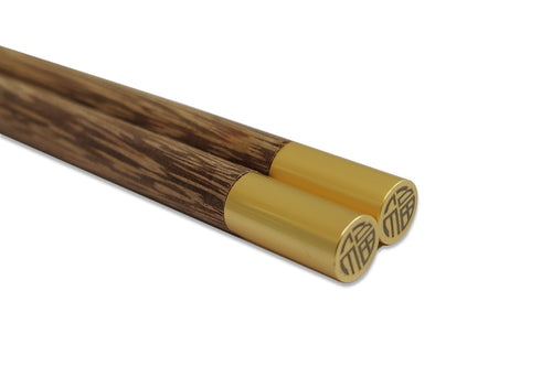 De eetstokjes zijn gemaakt van Ji-Chu-Mi hout wat herkenbaar is door de typische fijne structuur van het hout. Bovenaan zijn de Chinese stokjes voorzien van goudkleurige topjes met een gravure op de bovenkant, een symbool voor geluk.