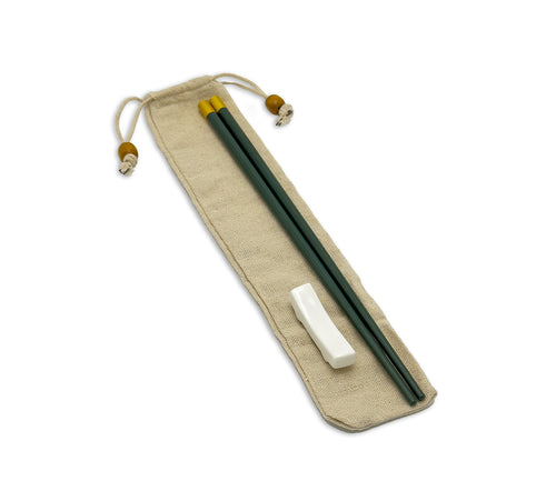 Deze mooie set bestaat uit twee paar chopsticks, twee chopstickhouders en een bijpassend opbergzakje in Beige Cotton.